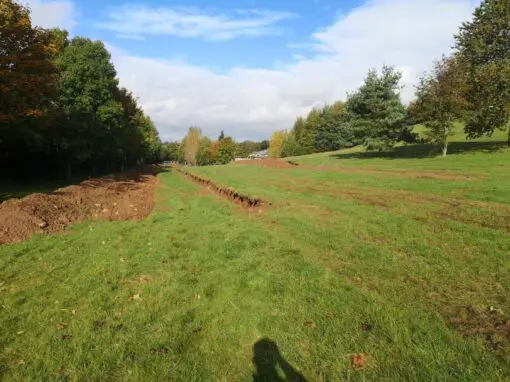 The ground source heat project teed off in September 2019 around the other building works taking place. 36 separate 200m trenches were dug and over 8000m of collector pipe laid during one of the wettest Autumns on record! During February and March the internal plumbing was completed with the installation of the heat pumps and storage tanks. Once operational the district heating system will qualify for the Renewable Heat Incentive.