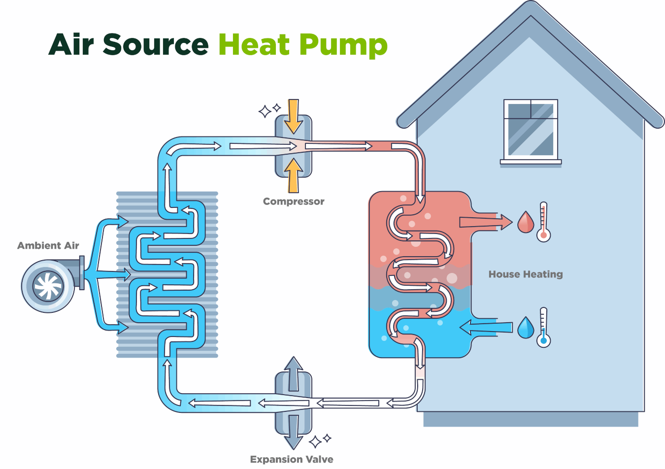Here’s a basic breakdown of how air-source heat pumps heat your home: